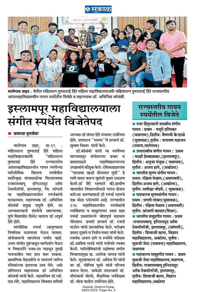 | 1 | Music Club Team | Mahiharatna Pushpatai Hire Sate Level Singing Competition 2025" organized by M. P. H. Arts, Science and Commerce College, Malegaon, Nashik | 17th January 2025 | General Championship Indian Group Song – 1st Rank Western Group Song – 2nd Rank Classical Singing – 1st Rank |