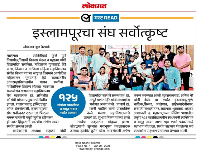 | 1 | Music Club Team | Mahiharatna Pushpatai Hire Sate Level Singing Competition 2025" organized by M. P. H. Arts, Science and Commerce College, Malegaon, Nashik | 17th January 2025 | General Championship Indian Group Song – 1st Rank Western Group Song – 2nd Rank Classical Singing – 1st Rank |