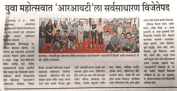 | 2 | Cultural Students Team | 44th Shivaji University Youth Festival (District Level) organized at ADCET Institute, Ashta | 23rd Sept. 2024 | One Act Play – 1st Rank - RIT Drama Club (One Act Play - Why Not …..?) Quiz Competition – 3rd Rank Debate Competition – 3rd Rank Elocution Competition (English) – Consolation Prize |
