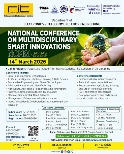 Rajarambapu Institute of Technology, Rajaramnagar (formerly known as the College of Engineering, Sakharale), was established in 1983. Situated near Islampur, just 7 km from Peth Naka on the Pune-Bangalore highway, the institute boasts a lush, green campus spread across 43 hectares, with a built-up area of 54,000 square meters. Over the past 43+ years, RIT has earned a reputation as a premier technological institute in Western Maharashtra, thanks to its dedicated and disciplined commitment to delivering quality technical education.